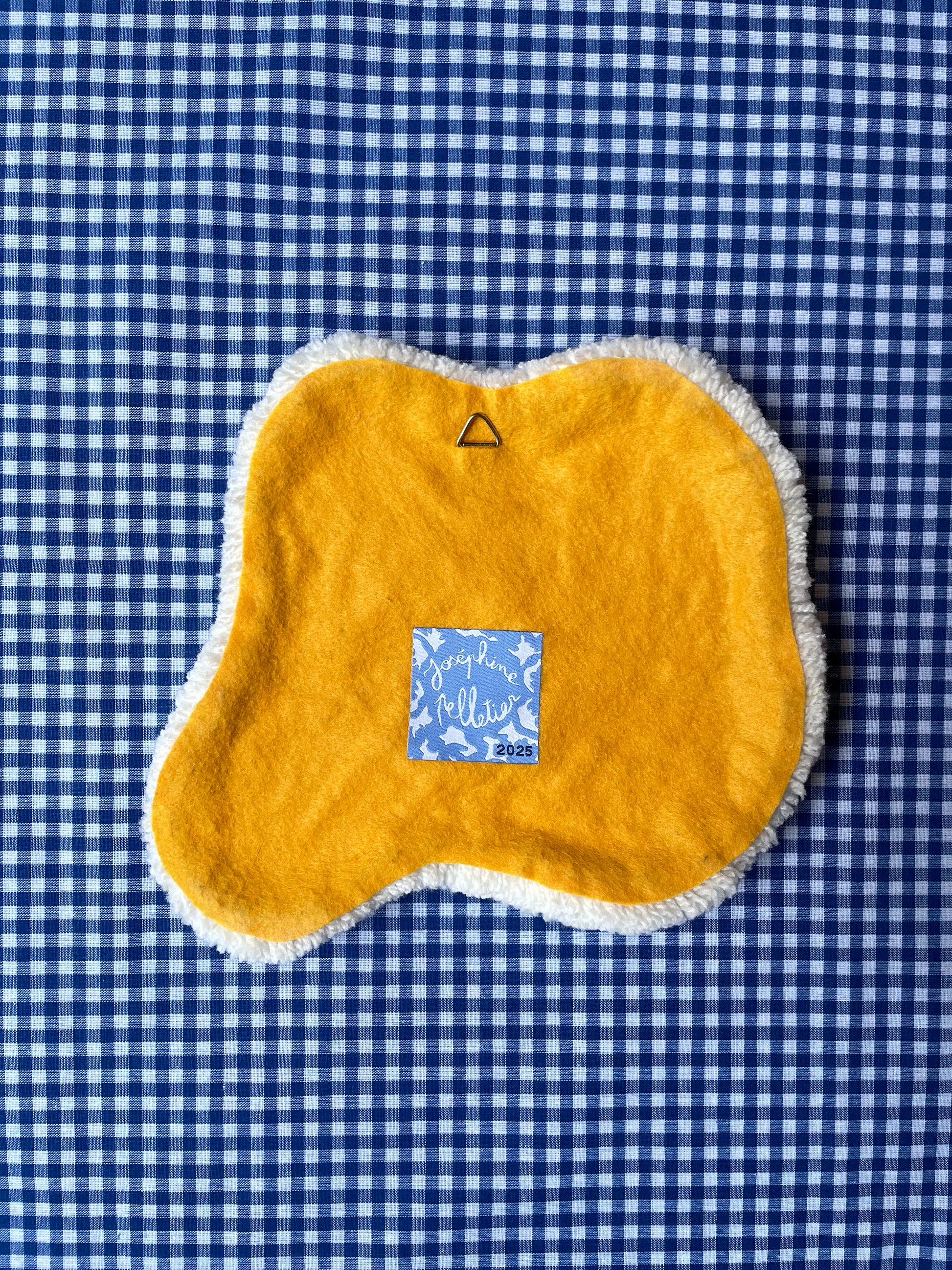 Laine acrylique (blanc cassé et jaune) et feutrine.