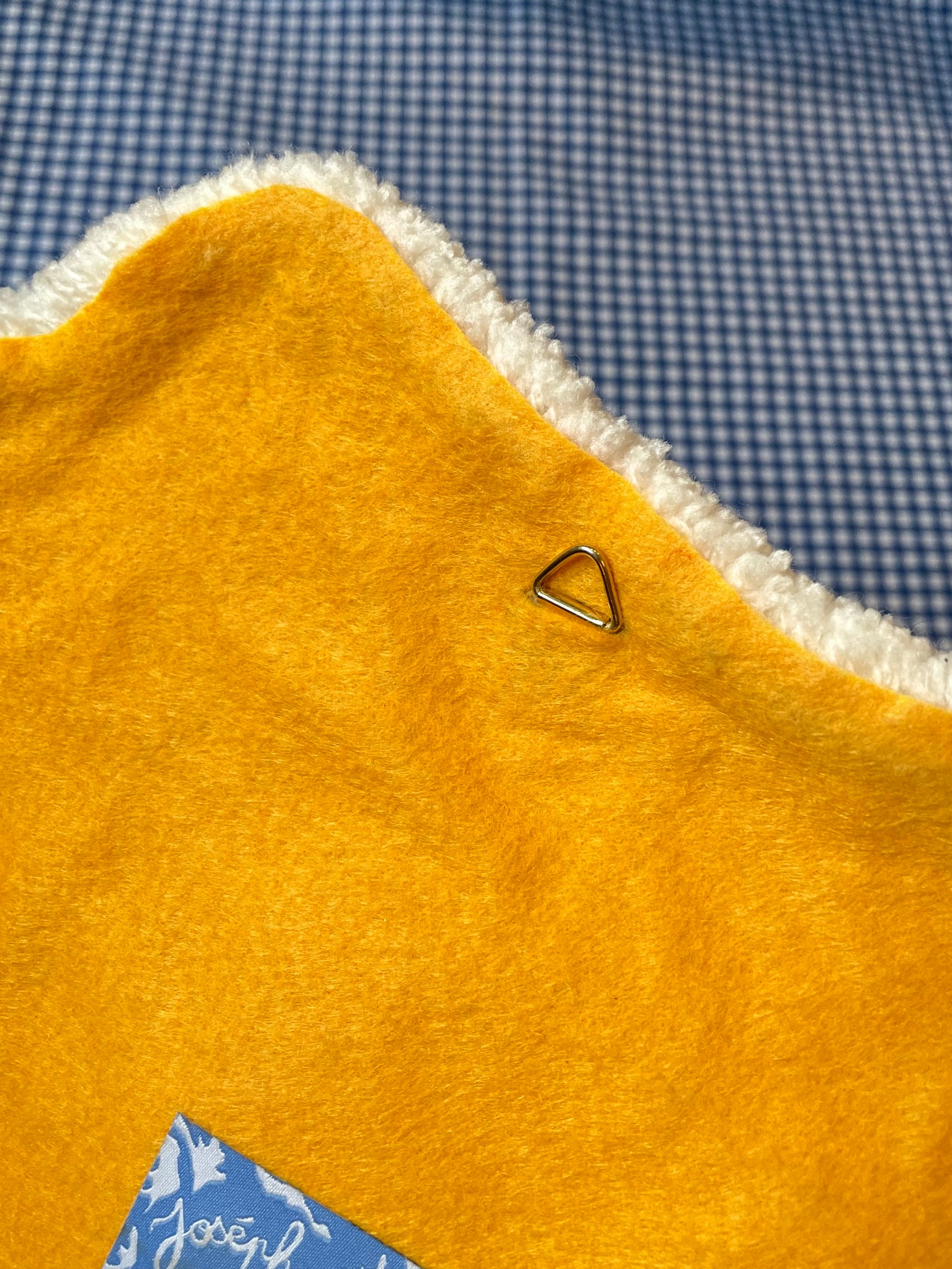 Laine acrylique (blanc cassé et jaune) et feutrine.